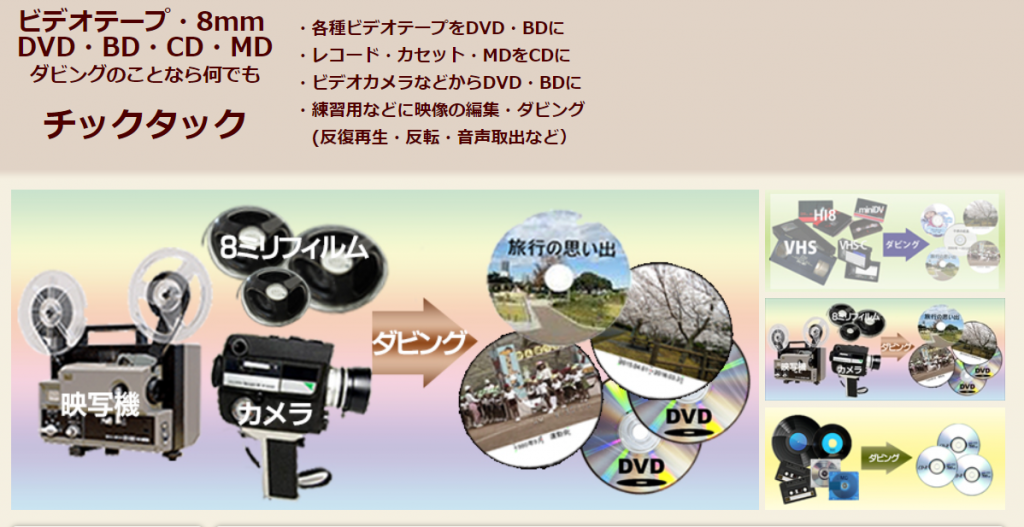 | 料金 | DVDダビング(1本あたり) 980円(120分以内) 120分以上は60分毎に+500円 |
